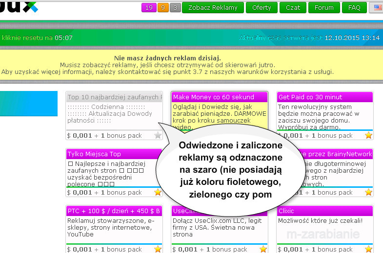 7. Odwiedzone i zaliczone reklamy są odznaczone na szaro (nie posiadają już koloru fioletowego, zielonego czy pomarańczowego). Każdą reklamę możesz odwiedzić tylko raz na 24 h, więc tych szarych już nie odwiedzaj.