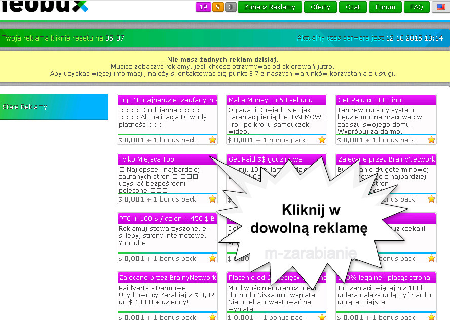 Neobux gwarantuje codziennie minimum 4 reklamy dla użytkowników posiadających konto standardowe i minimum 9 reklam dla użytkowników z kontem „Gold”. To jest minimum, ale codziennie pojawia się ponad 15 reklam.