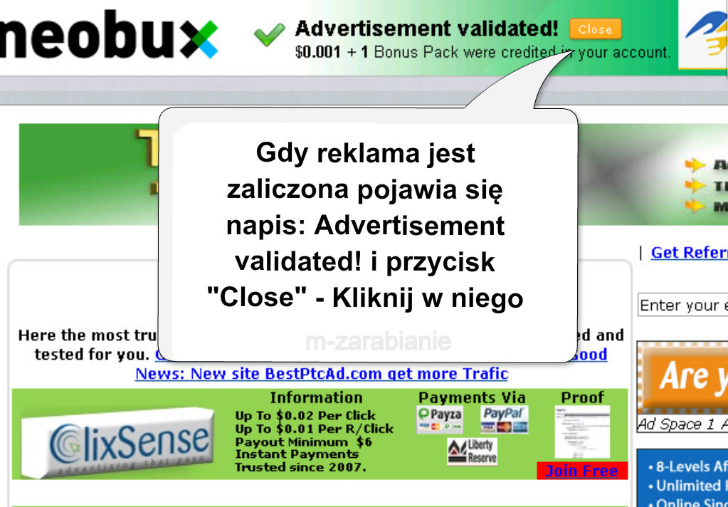 6. Gdy zaliczysz reklamę, pojawi się napis: Advertisement validated! i pomarańczowy przycisk „Close”. Naciśnij ten przycisk, aby powrócić do strony z kolejnymi płatnymi reklamami.