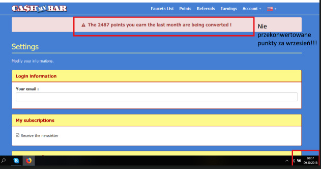 W tym roku 2018 zacząłem przeczuwać że administratorzy tegoż programu nie będą chcieli sprawić bym dotarł do upragnionych 5$ mimo że miałem ich surfbar włączony codziennie od prawie 2 lat i tak też się stało, a mianowicie: od dłuższego czasu gdy włączałem na laptopie MyCashBar zaczęły się pojawiać komunikaty na ekranie laptopa o,, nie współgraniu” programu MyCashBar z opragramowaniem NET Framework które miałem zainstalowane na laptopie,mimo tego bagatelizowałem komunikat i dalej wyświetlały się reklamy z opisywanego surfbaru, potem surfbar włączał się przy starcie laptopa ale nie wyświetlał reklam ale najciekawsze jest jak po danym miesiacu miała być konwersacja punktów na $ i ku mojemu zaskoczeniu ta konwersacja nie nastąpiła za miesiac sierpień 2018r a co najciekawsze punkty za sierpień 2018r zniknęły i na moim koncie w tym surfbarze nie ma miesiaca sierpnia 2018r. tak jakbym cały miesiac miał wyłączony surfbar a przecież miałem go włączonego i miałem punkty czekajace na konwersację. Napisałem do administratora oto korespondecja: